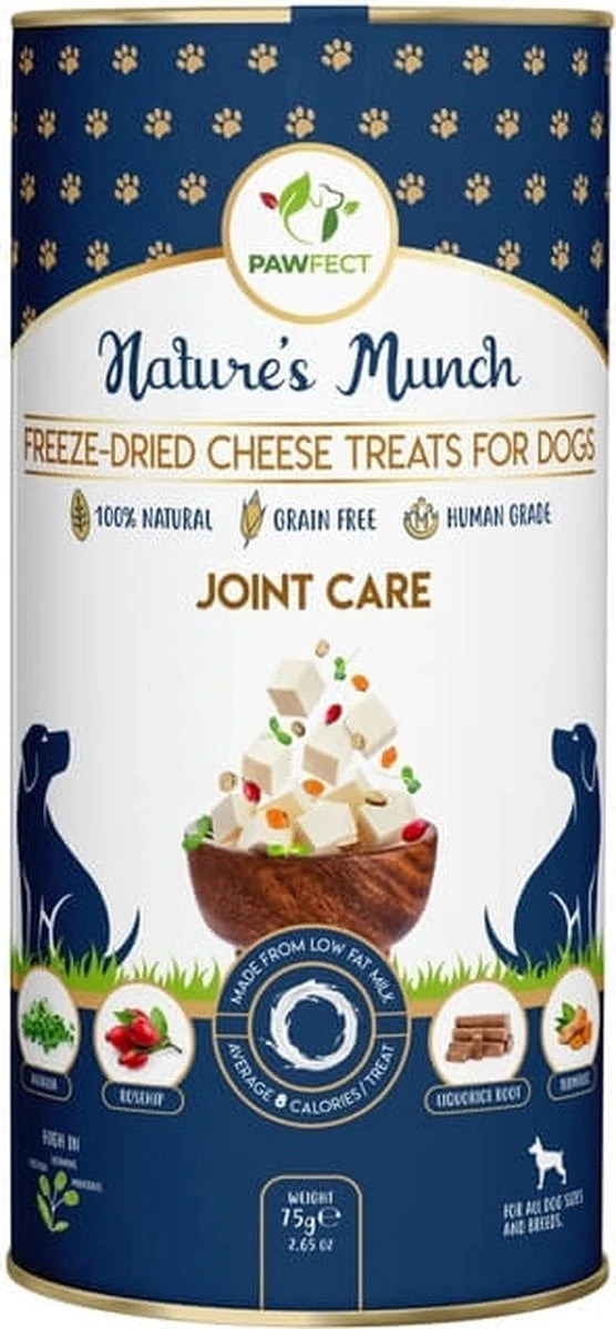 Pawfect Functionele Freeze Dried hondensnack Gewricht Verzorging 75 gr. Heerlijke voedzame snacks gemaakt van cottage cheese gemengd met luzerne, zoethoutwortel, rozenbottel en kurkuma. Deze snacks zijn speciaal samengesteld voor honden met gewrichtsproblemen en hele actieve (sport)honden. Ze zijn gevriesdroogd om zo de zorgvuldig geselecteerde ingredienten te behouden. Deze snacks worden aanbevolen om de gewrichten te helpen ondersteunen. De combinatie van luzerne, rozenbottel, zoethoutwortel en kurkuma zorgt voor een vermindering van pijn en ontstekingen. Daarnaast krijgt het immuumsysteem een extra boost en beschermd het kraakbeen. Net als de voedingen en andere snacks van Pawfect, zijn deze snacks gemaakt van 100% natuurlijke ingrediënten en bevatten ze geen toegevoegde, kleur-, geur- en smaakstoffen of conserveringsmiddelen. Daarnaast zijn ze vrij van gluten, granen en soja.