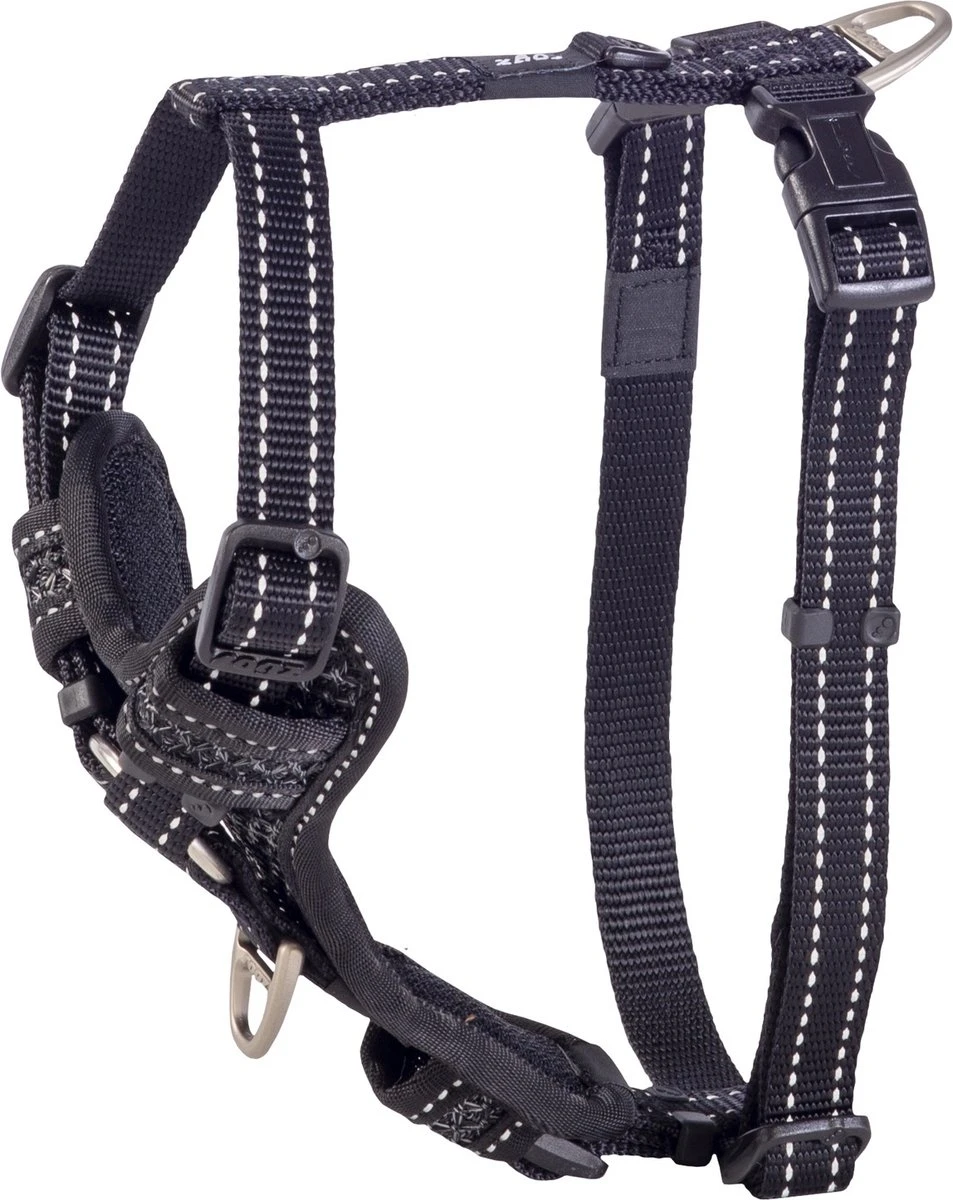 Het tuig is voorzien van dubbele gespen voor een gemakkelijke pasvorm. Daarnaast beschikt dit tuig over een stop-trekbesturing. Door de lijn aan de borstring te bevestigen, heb je meer controle bij het sturen door van richting te veranderen. Met het bevestigen van de lijn bovenop de rug, kan je de hond gemakkelijk laten stoppen. Bij normaal gebruik maak je de lijn alleen vast aan de ring bovenop de rug. Ook is het mogelijk om een penning te bevestigen aan het tuig. De reflecterende stiksels zorgen voor extra zichtbaarheid in het donker.